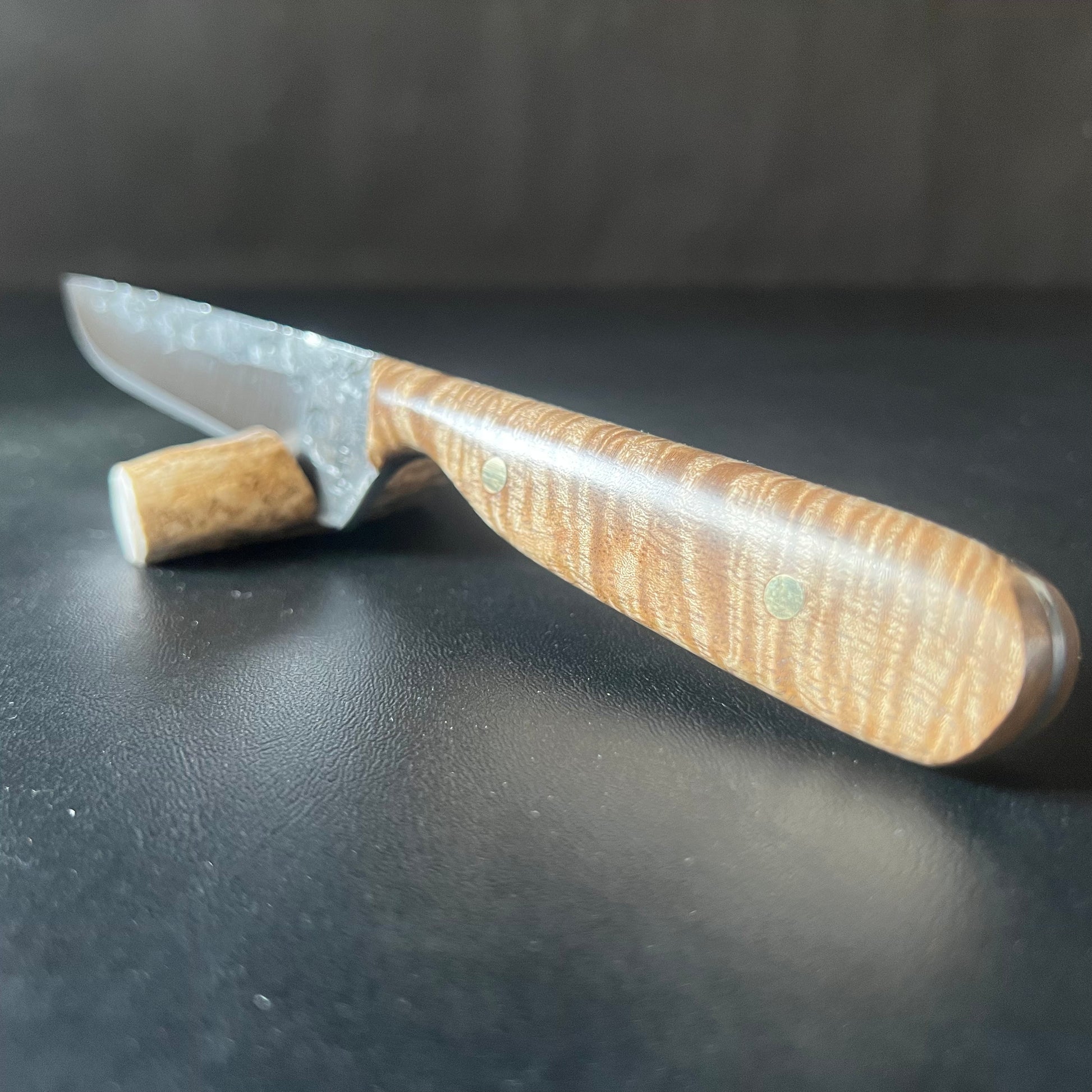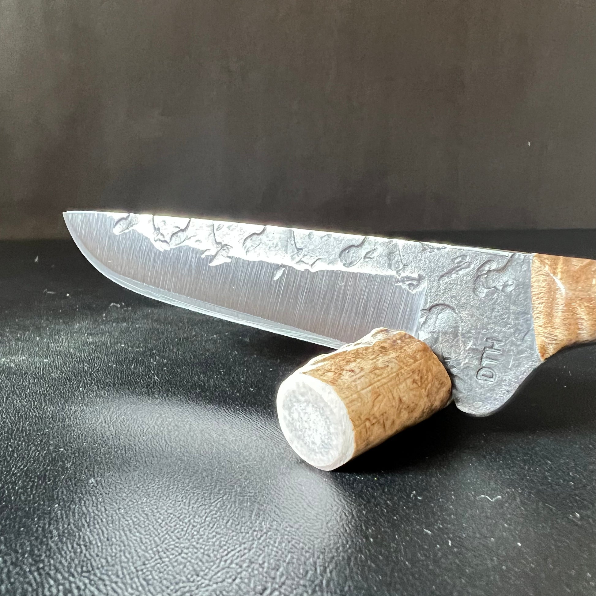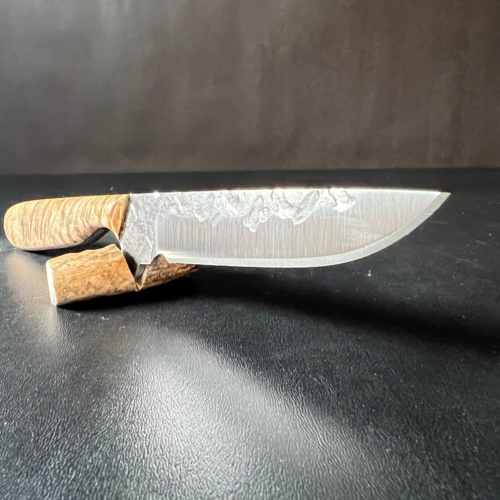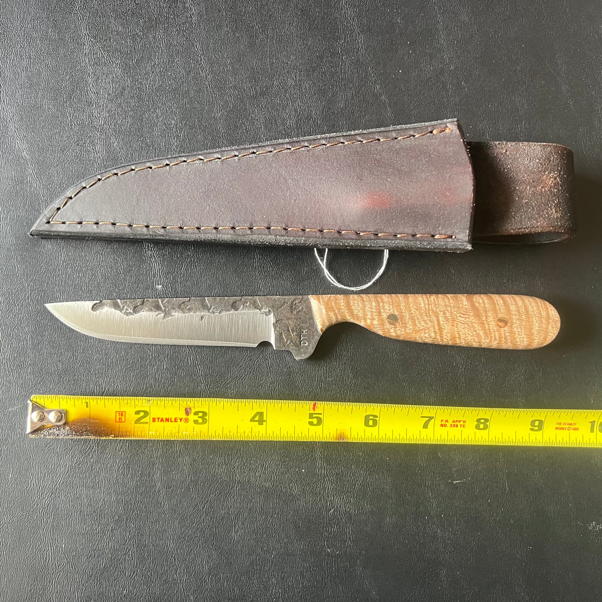 This knife has a clip point style blade made with 1095 high carbon steel. The handle is made from a stabilized top notch curly mango wood. This knife also comes with a high-quality leather verticle sheath that can be worn right or left and is stained brown.