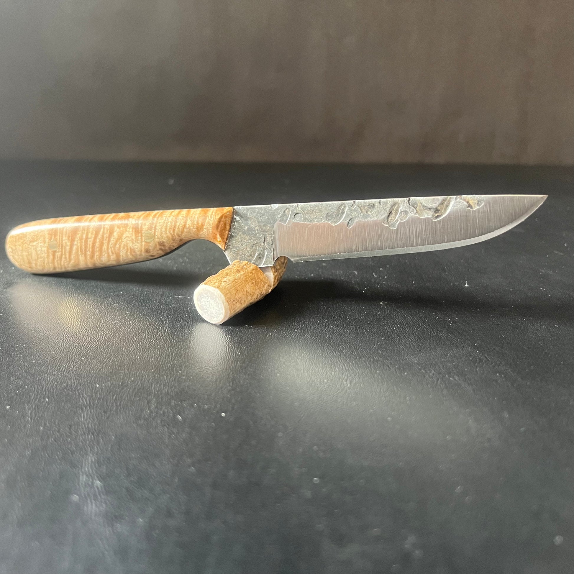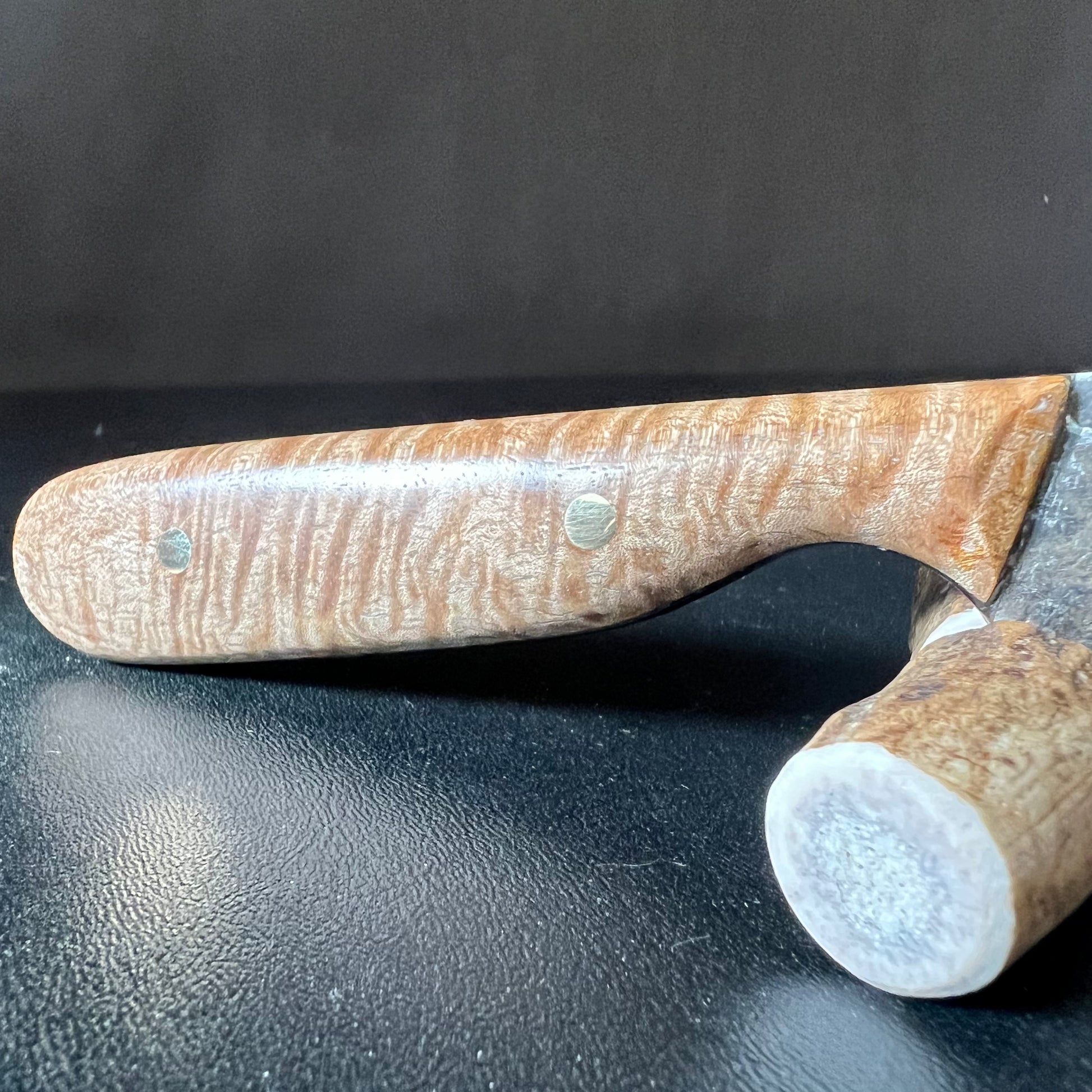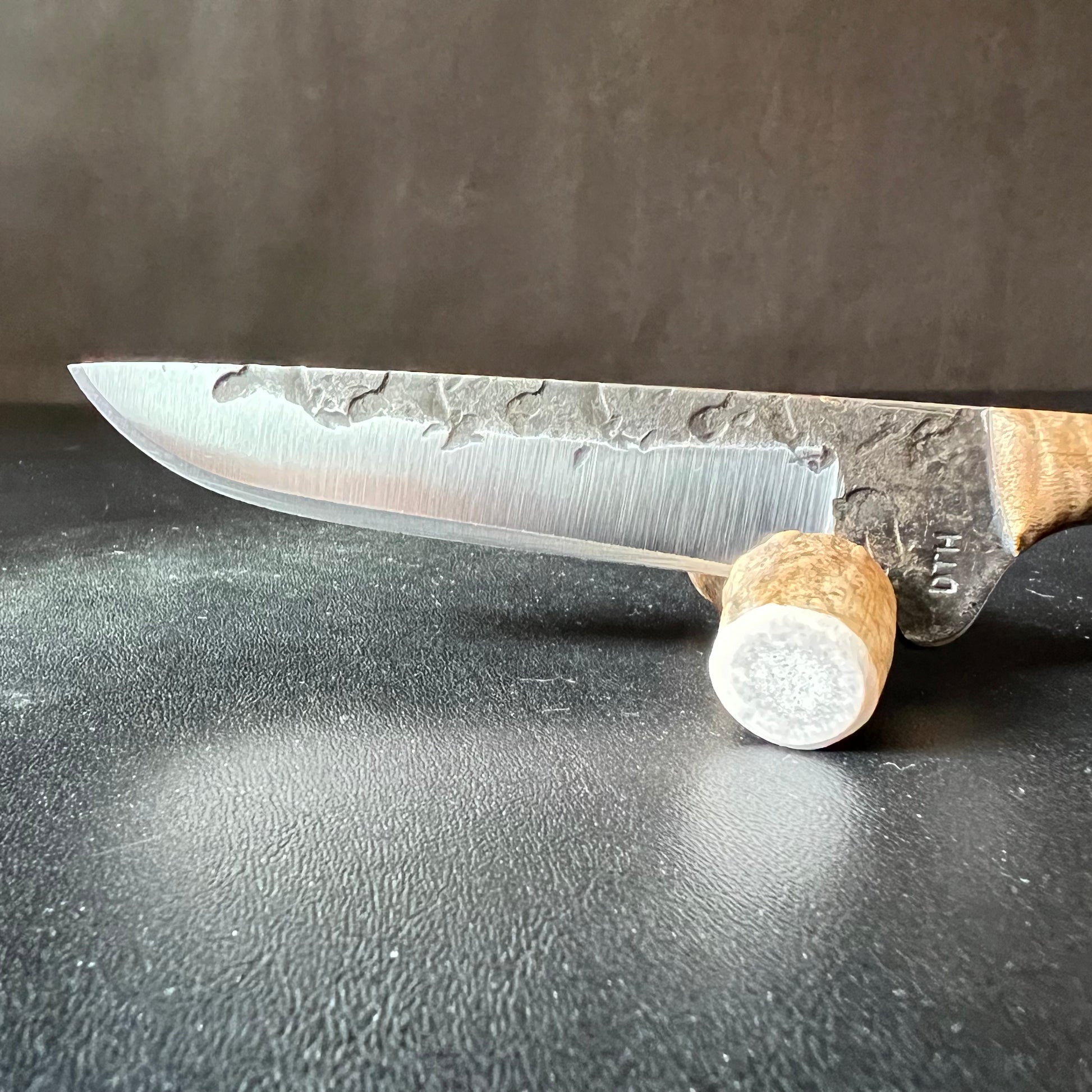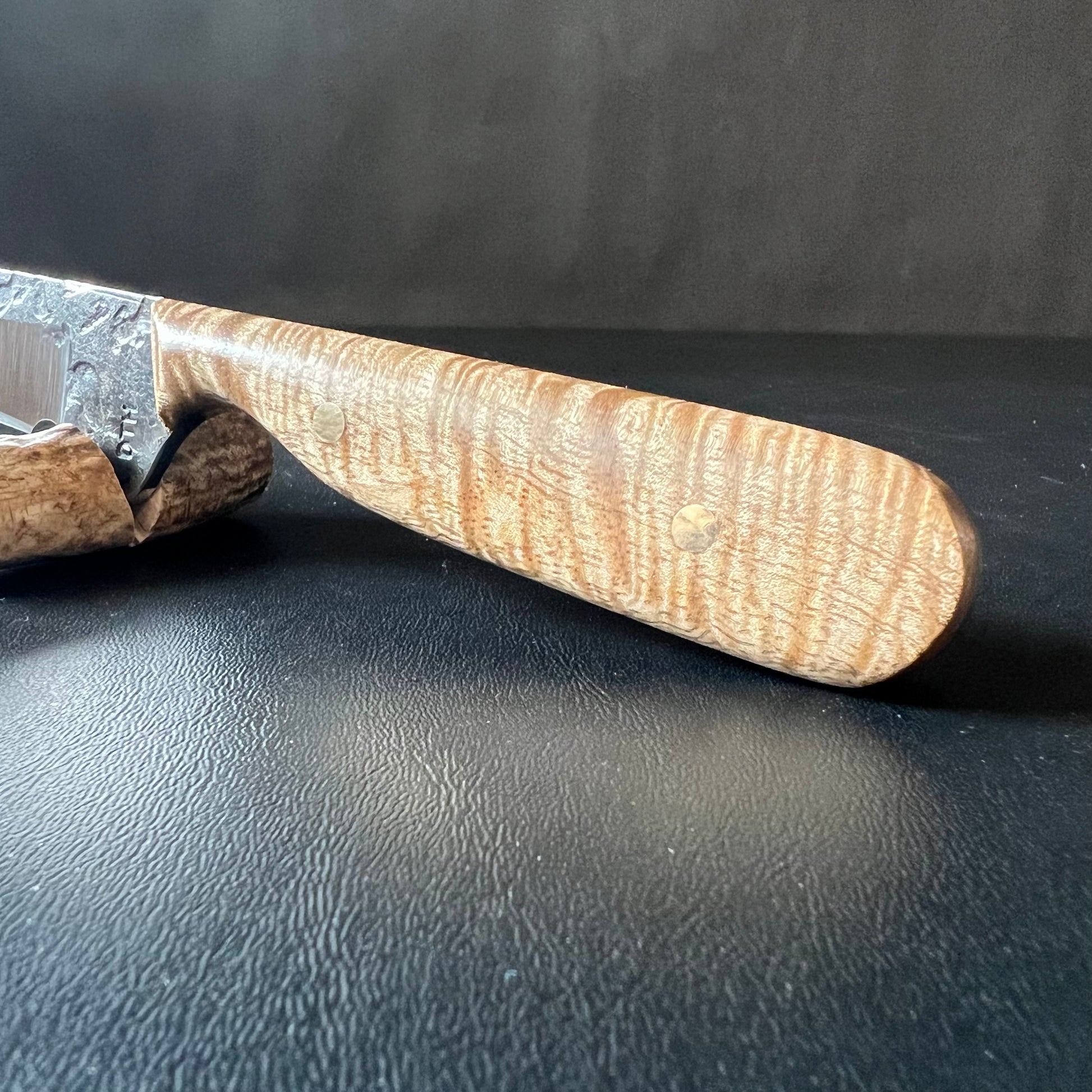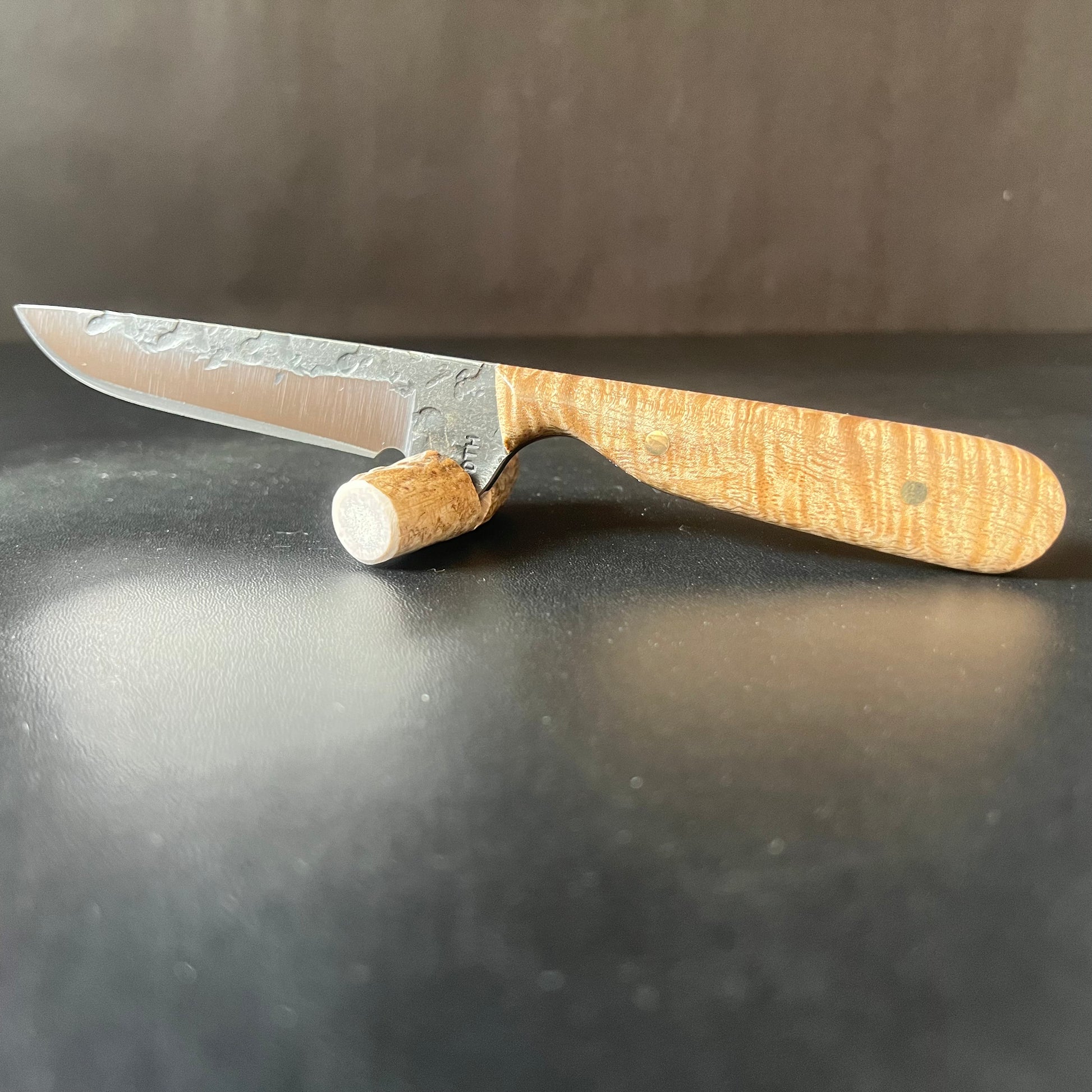 This knife has a clip point style blade made with 1095 high carbon steel. The handle is made from a stabilized top notch curly mango wood. This knife also comes with a high-quality leather verticle sheath that can be worn right or left and is stained brown.