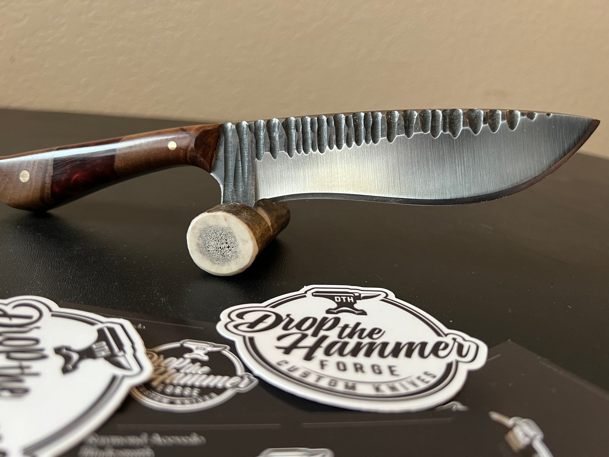This knife has grinder marks on its 1095 high carbon recurve style blade with almond wood and ruby resin handle and brass pins. The vertical custom sheath is dyed brown.