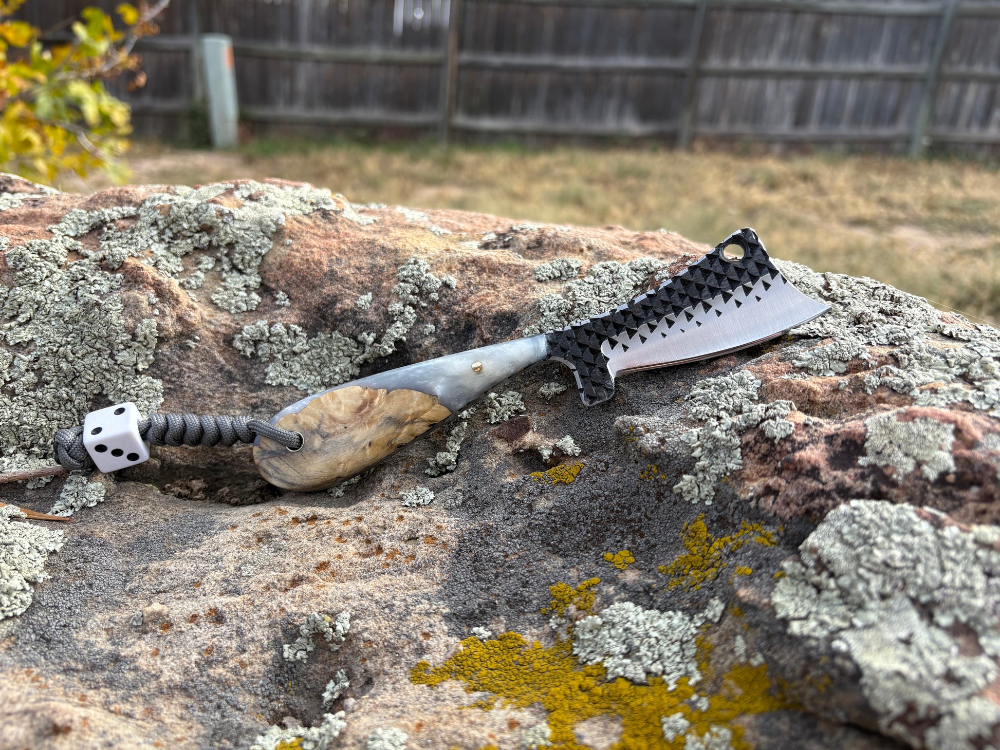 A bold yet refined blade forged from a reclaimed rasp, blending strength and sophistication. The handle features stabilized buckeye wood paired with shimmering white pearl resin — a striking contrast of nature and polish. Compact, balanced, and built for daily carry or display, this handmade piece from DTH Knives brings craftsmanship and class together in one sharp package.